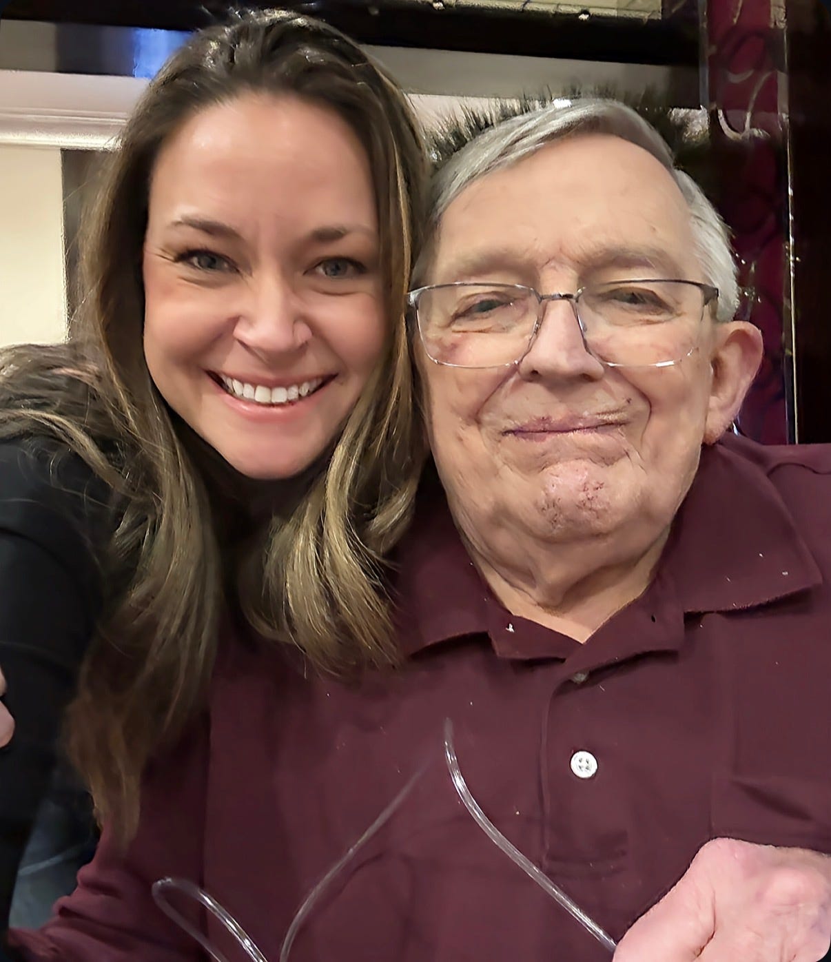 Photo ID: Kelly is smiling while leaning over Mr. Peterson’s shoulder who is also smiling. Mr. Peterson is an older man with white hair and glasses wearing a maroon polo shirt.