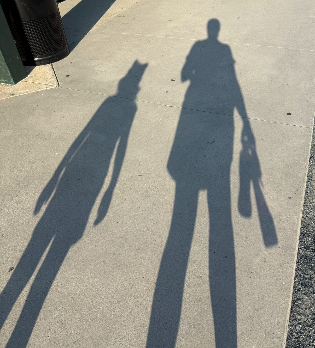 ID: Anessa and Kelly’s shadows on a cement sidewalk. Anessa appears to have cat ears (due to a headband she has worn every day for the last two weeks) and Kelly is holding multiple items in her free (non picture-taking hand).